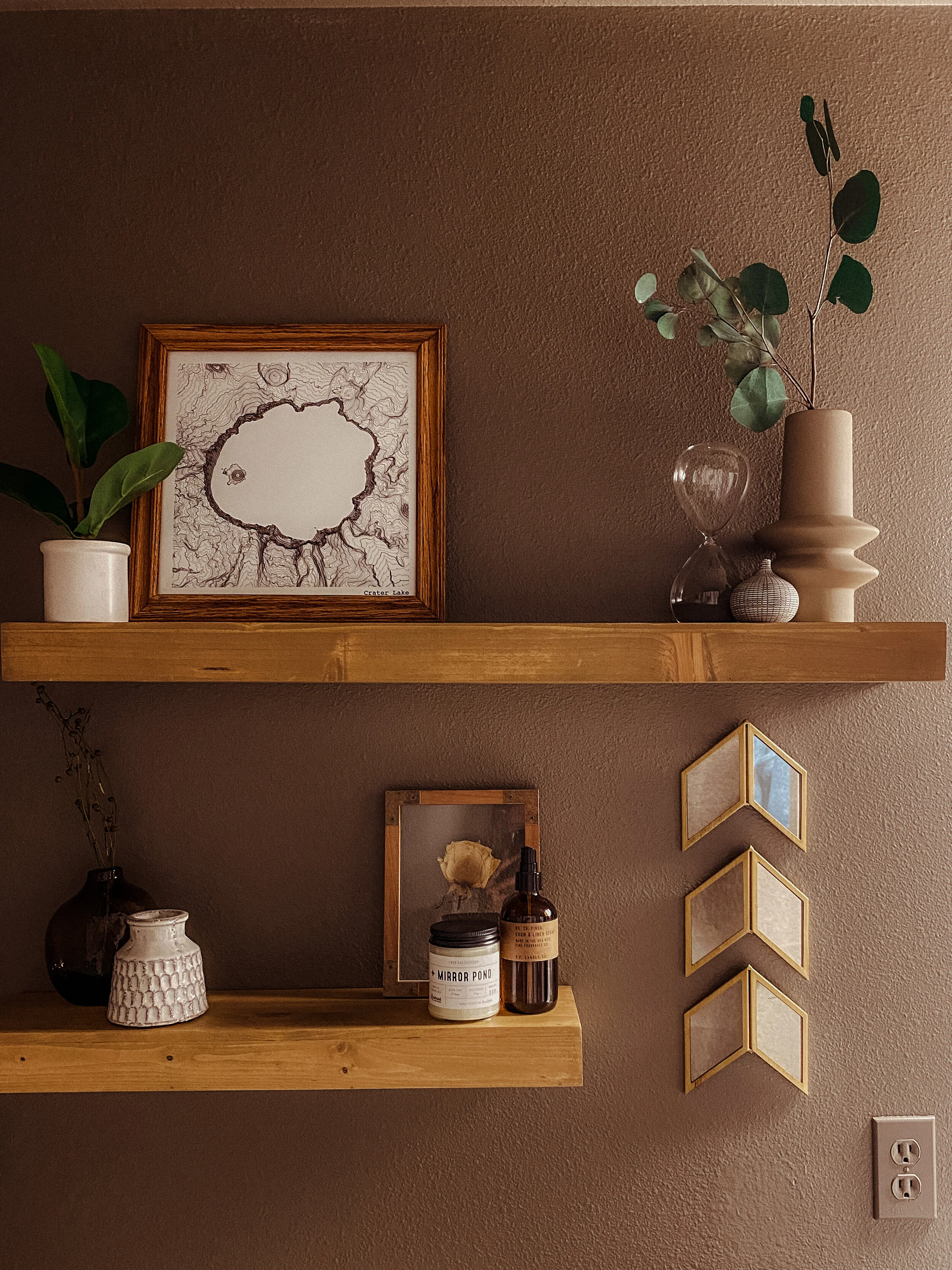 I continued with the open shelving concept in this bathroom and found these at Target. I really love the light wood grain compared to the darker walls/ceiling. After shopping in our #shelfie supplies bins, I stopped at a few local boutiques to add the finishing touches with the print of Crater Lake, beautiful pottery, candle, room spray and hourglass. Dried greenery is from Hobby Lobby and the frame was thrifted.